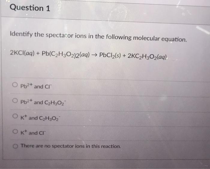 Solved Question 1 Identify The Spectator Ions In The Chegg Com