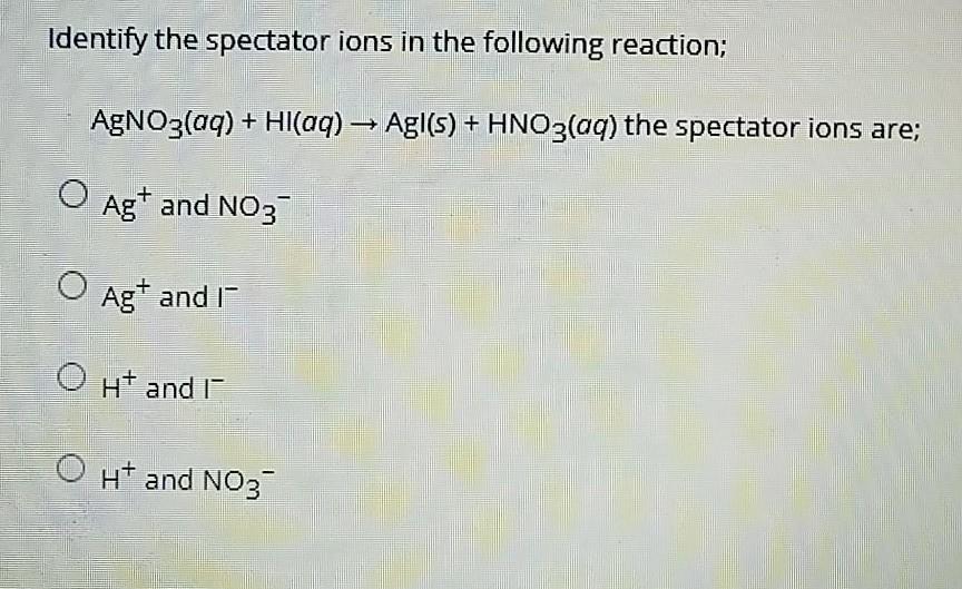 Pb2 K Cl and NO3 d. That are made of a single element D. In the reaction between HNO₃ and BaOH₂ assume complete reaction of the BaOH₂ the spectator ions are H aq OH aq H₂O l Which one of the following represents the net ionic equation for the reaction of HBr with CaOH₂.